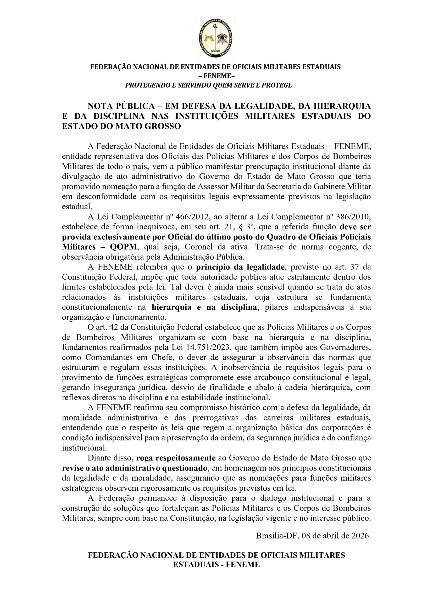 NOTA PÚBLICA – EM DEFESA DA LEGALIDADE, DA HIERARQUIA E DA DISCIPLINA NAS INSTITUIÇÕES MILITARES ESTADUAIS DO ESTADO DO MATO GROSSO
